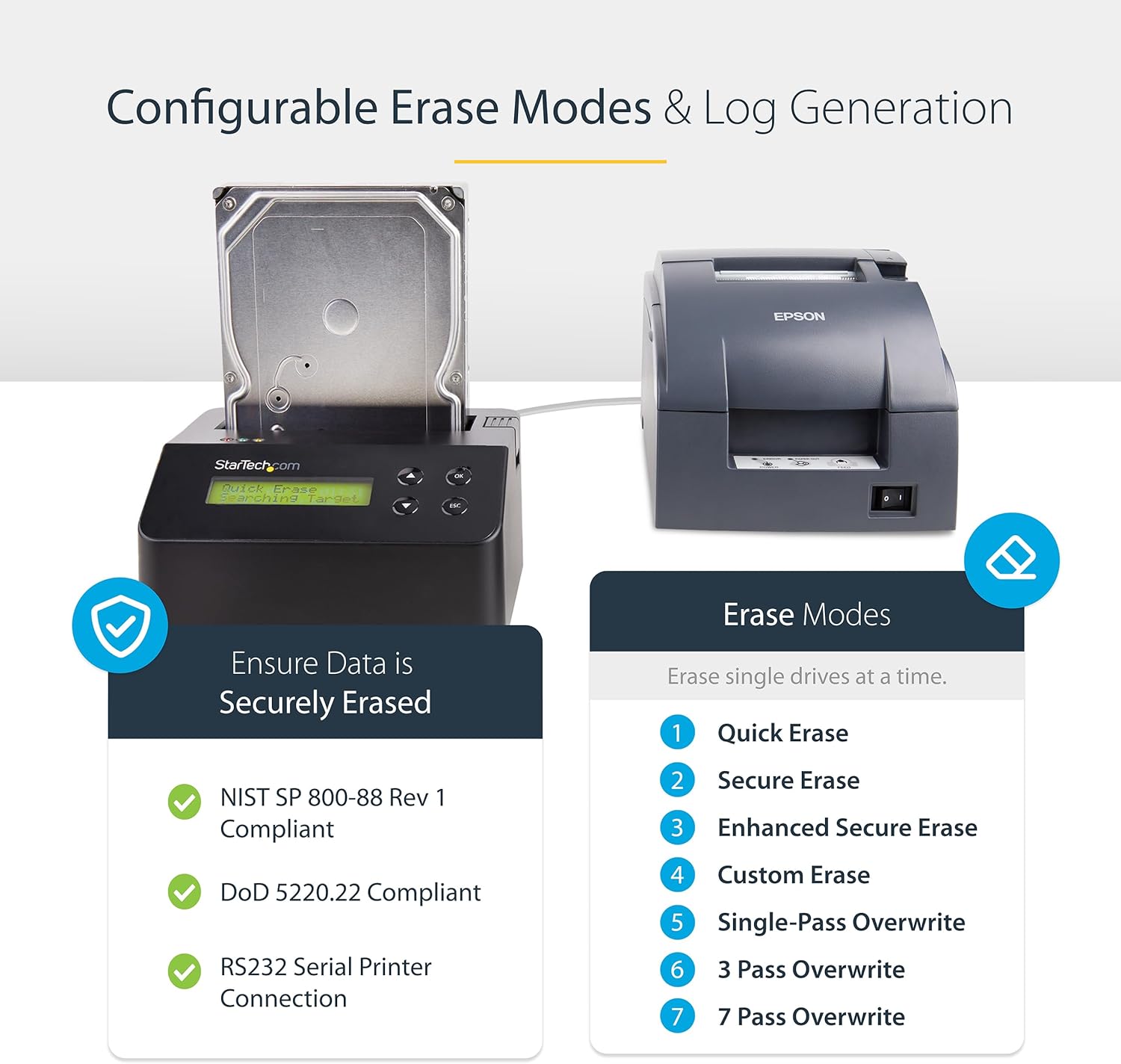 - ERASE MODES: 9 erase modes including Quick Erase, Single/3/7 Pass Overwrite, Custom Erase, Secure & Enhanced Secure Erase (meets NIST SP 800-88 Rev 1 clear/purge); DB-9 (RS232) Printer Port; USB 3.2 Gen 1 (5 Gbps); Toolless Design; DoD / TAA Compliant