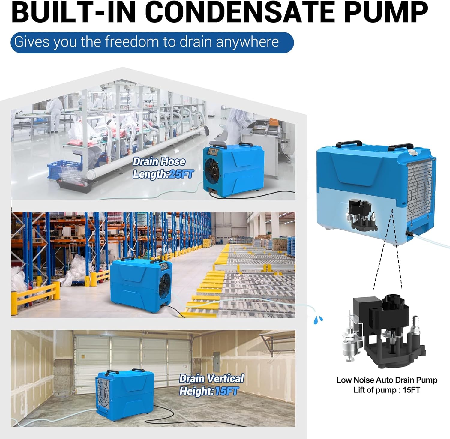 - Built-in Pump and Memory Restart: With a built-in pump, this dehumidifier can easily drain collected water to a desired location. Additionally, it has a memory restart function that automatically resumes operation after a power break, ensuring continuous and uninterrupted dehumidification.