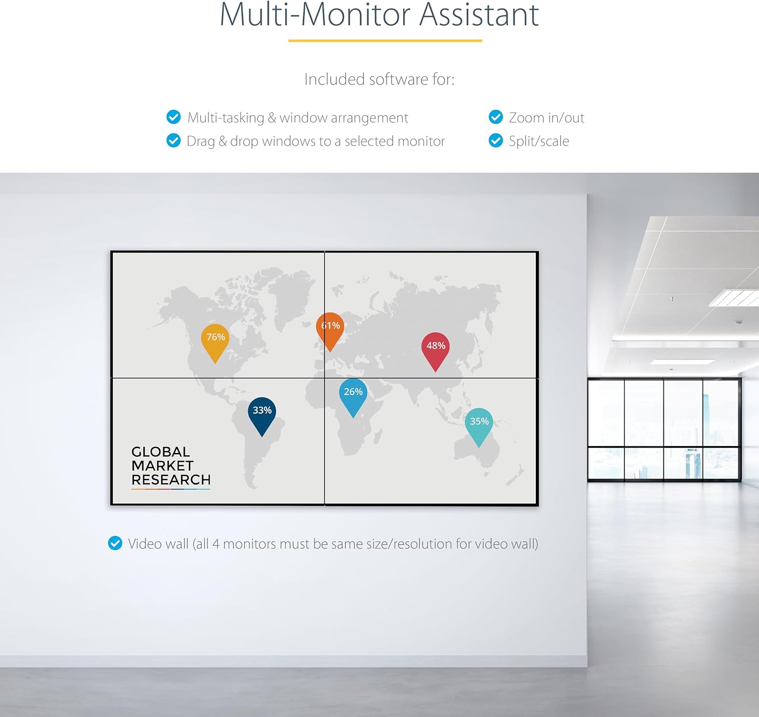 - EASY SETUP: USB-A to HDMI quad monitor adapter dongle is equipped w/ a 3.3ft (1m) attached USB-A cable for added distance between the adapter & host device for multiple monitor workspace or HDTV boardroom setup