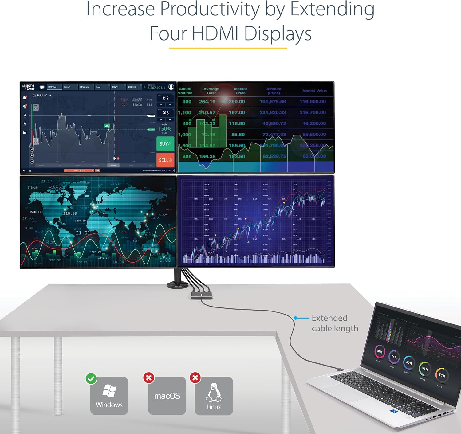 StarTech.com USB 3.0 to Quad HDMI Adapter, USB to 4x HDMI Monitor Converter for Windows, TAA (no support for macOS/ChromeOS/Linux)