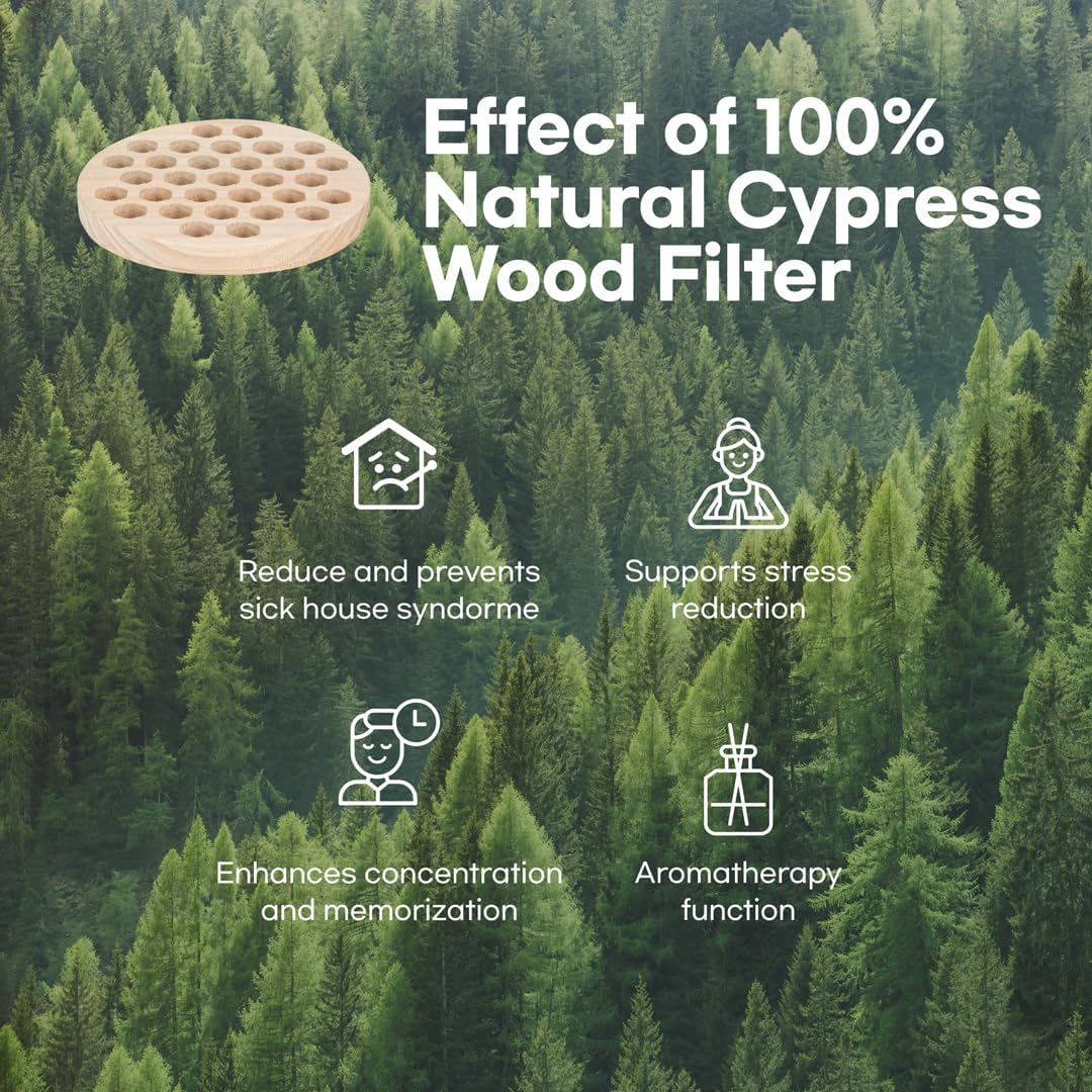 - 4-stage filtration: H13 true HEPA filter, deodorization carbon filter, pre-filter, and cypress wood filter. H13 true HEPA filter removes 99.97% of particles, capturing allergens, pet hair, dander, smoke, odor, and large dust particles