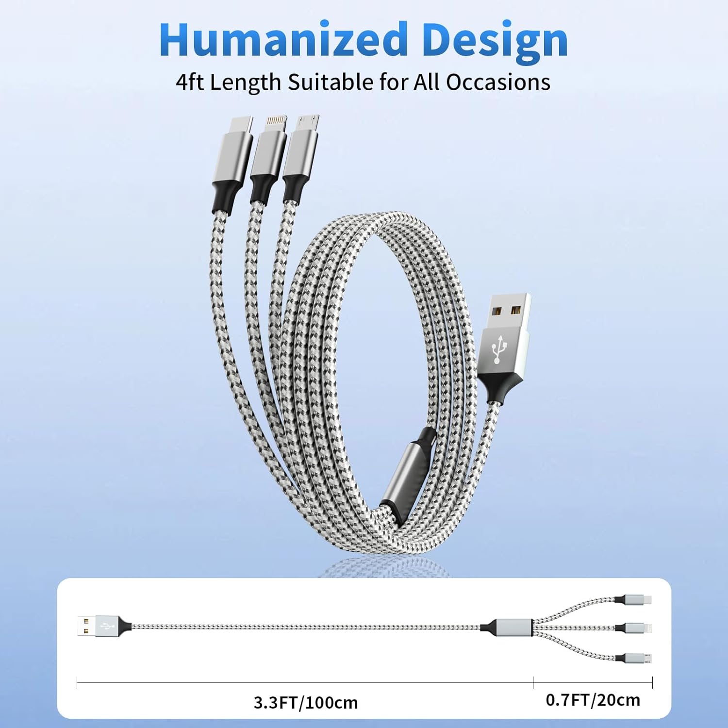 Multi Charging Cable, (2 Pack 4FT) Multi USB Charger Cable 3 in 1 Charging Nylon Braided Fast Charging Cord with Type-C, Micro USB, IP Port for Most Phones/iPhones/Tablets