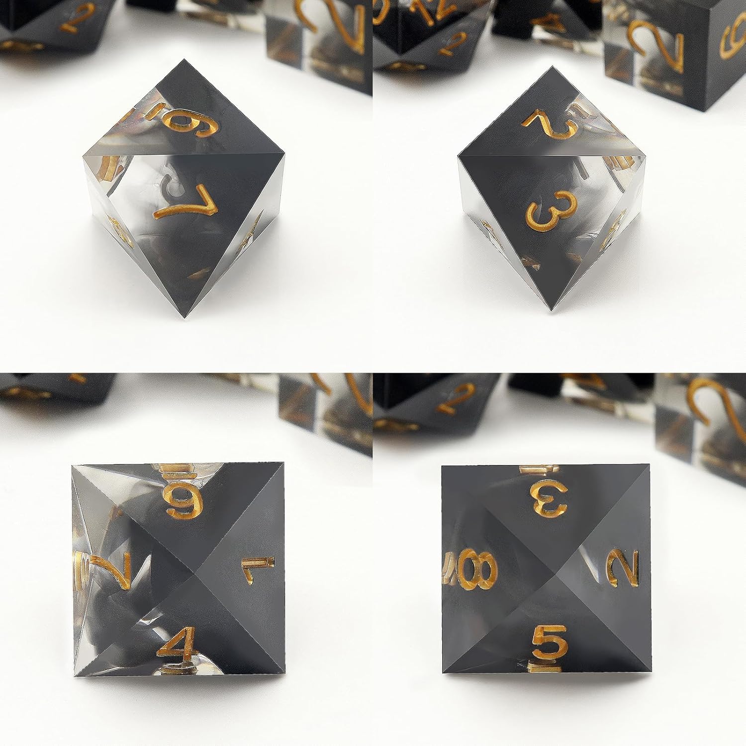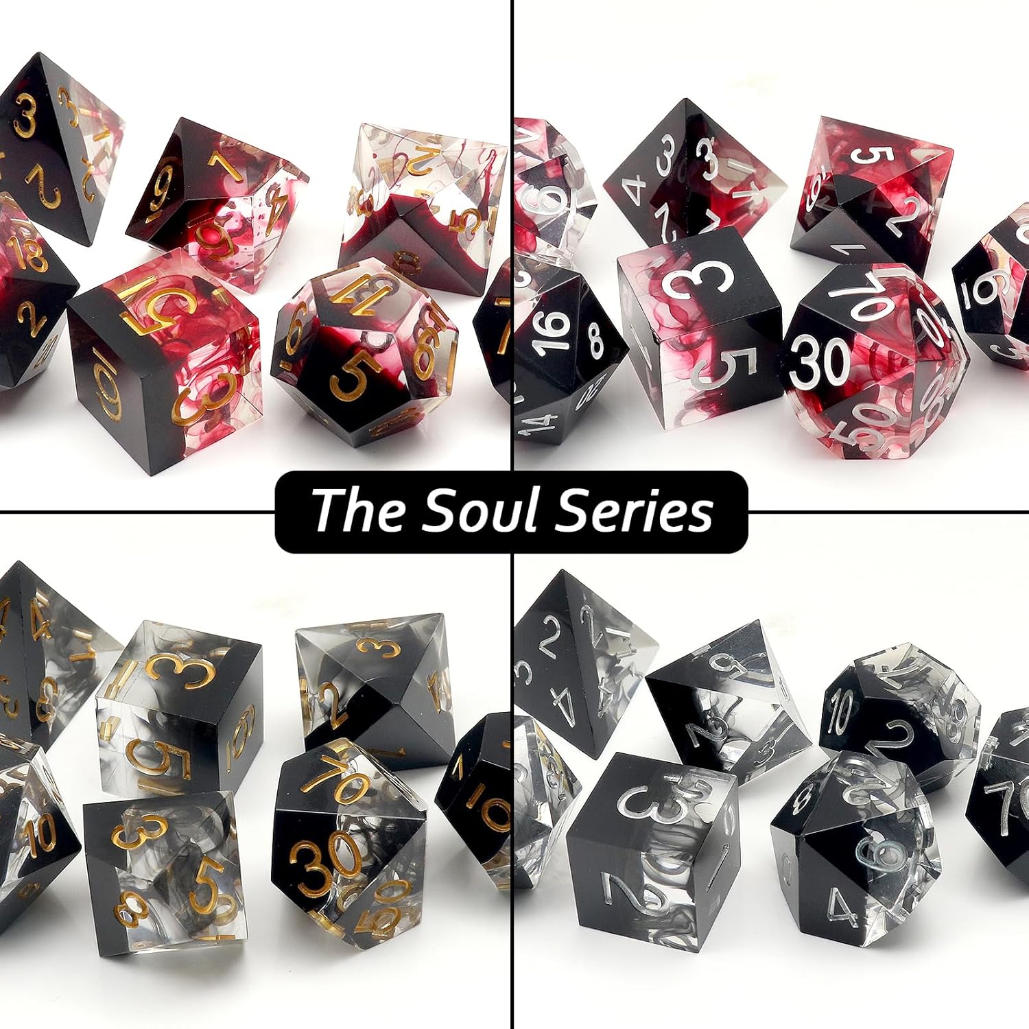- Handmade Quality Resin Dice Set: The Soul series features sharp edged dice displaying scenes of floating swirls like breath of the dragon. All dice are crafted by our experienced resin aristists and hand picked to be visually perfect before shipping. Surfaces are polished to be mirror. As they are handmade, each set will vary slightly in color proportions and inclusion placement.