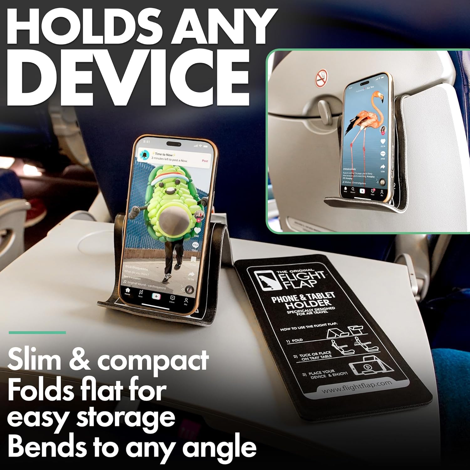 - FOR PHONES, TABLETS, BOOKS – The FLIGHT FLAP plane phone holder accommodates a wide range of phones (iPhone, Android), small tablets and e-readers (Kindle), handheld gaming consoles (Nintendo Switch) or your favorite books.