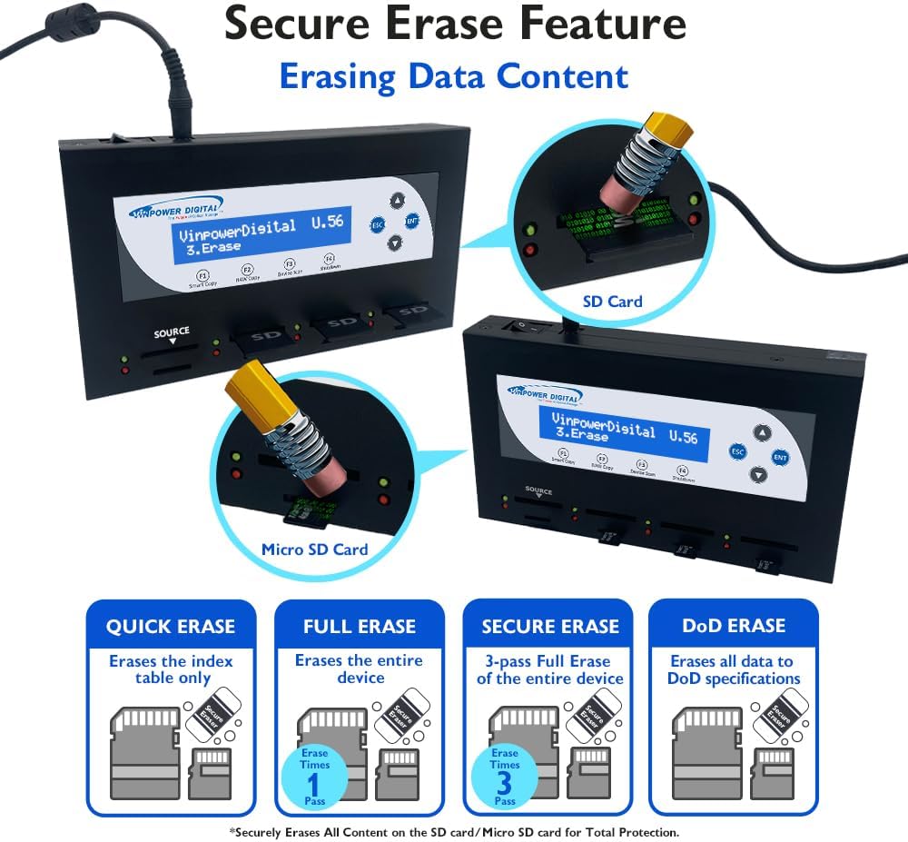 - [Secure Erase] Able to fully erase all data ever stored by performing a process like the DoD 5220.22-M standards. This will erase all content on the SD/MicroSD Card without leaving any trace of data, making it completely impossible to recover any previously erased data.