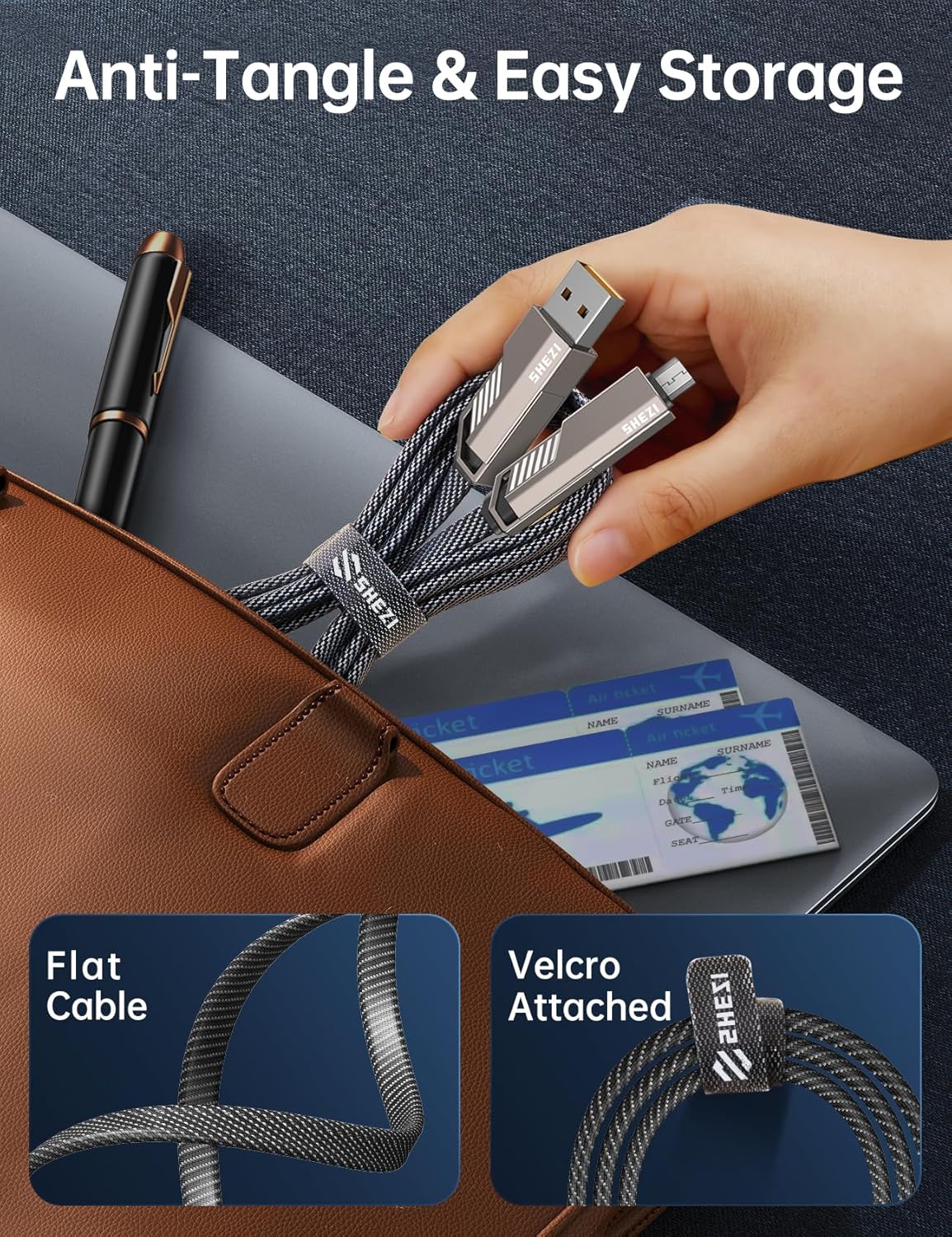 - 60W Fast Charging & 480mbp/s Data Transfer: 4-in-1 USB cable offers high-speed and safe charging up to 60W, enabling faster charging compared to standard cables. It can charge a Samsung S24 Ultra phone to 80% in 30 minutes (actual speed depends on your device and charger). The cable supports data transfer at 40-60MB/s, allowing a 1GB file transfer in 20 seconds. Compatible with iPhone, Samsung, tablets, Air, Mini, Pro, MacBook, and more, this cable saves time and enhances efficiency