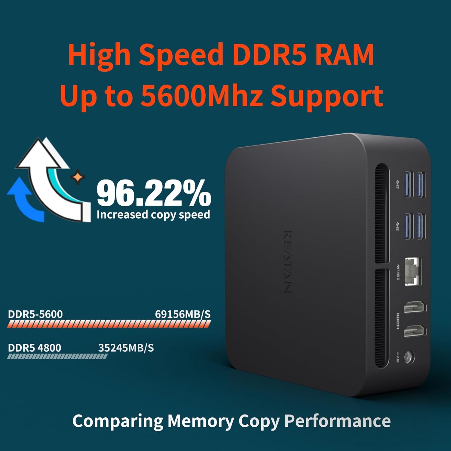 - 【Powerful AMD Ryzen 9 7940HS Processor】Reatan Alloy 9 AMD Ryzen 9 7940HS mini pc, 8 cores/16 threads (16M cache, up to 5.2GHz), using TSMC 4NM process, AMD Radeon 780M (graphic frequency 2.8GHz), equipped with AMD Ryzen AI technology, can provide high efficiency for various AI applications without affecting CPU and GPU performance.It has a powerful hardware configuration that is capable of handling games such as Black Myth: Wukong. Whether it's flashy special effects or complex battle scenes, it runs smoothly and unhindered.
