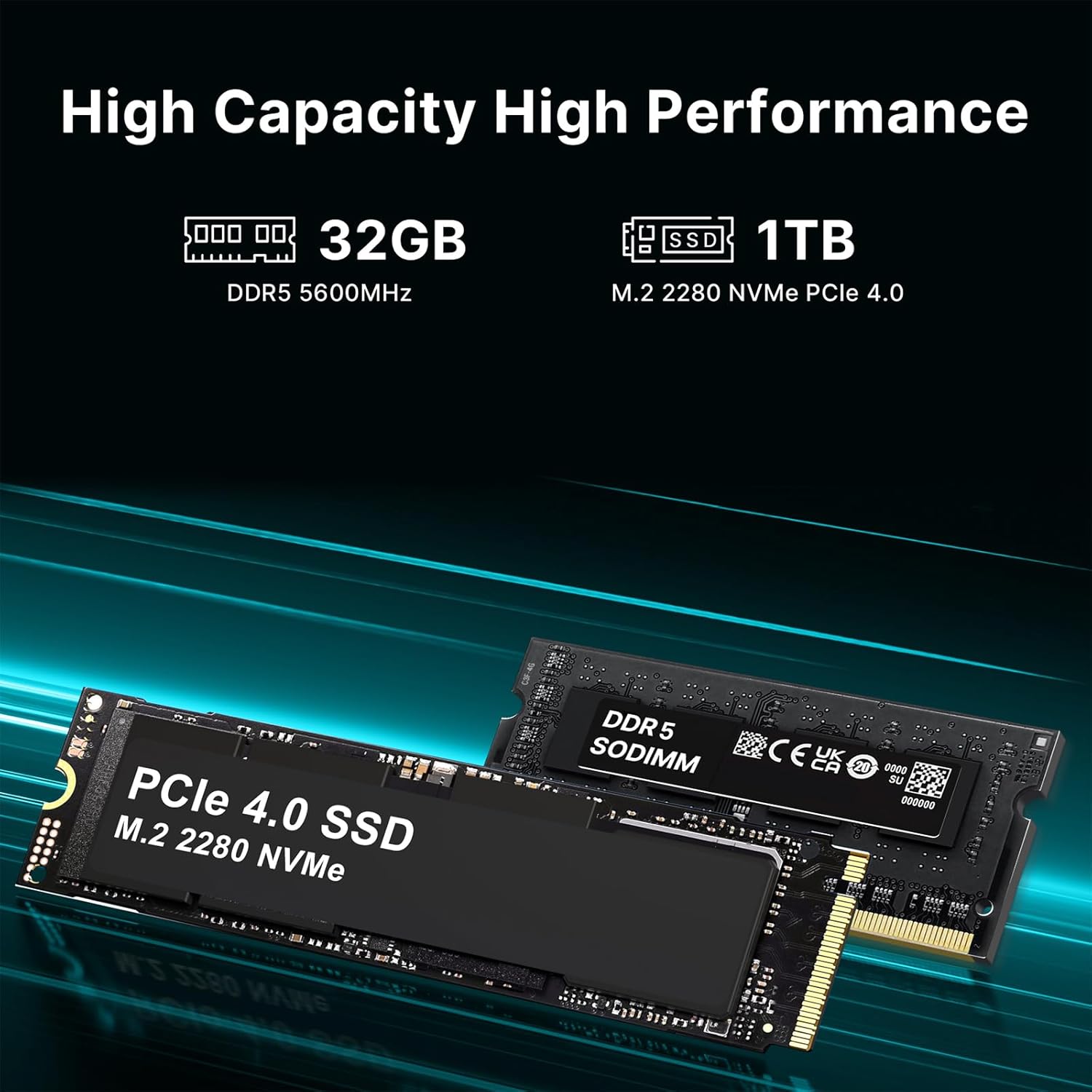 - 【 Configuration 32GB RAM and 1TB M.2 SSD】Installed with DDR5 5600 32GB RAM. Featured with 1TB M.2 2280 PCIe 4.0 SSD, High-speed read and write speed.without worrying about lack of capacity, you can run software smoothly, watch and storage large-scale movies, photos without any stress.