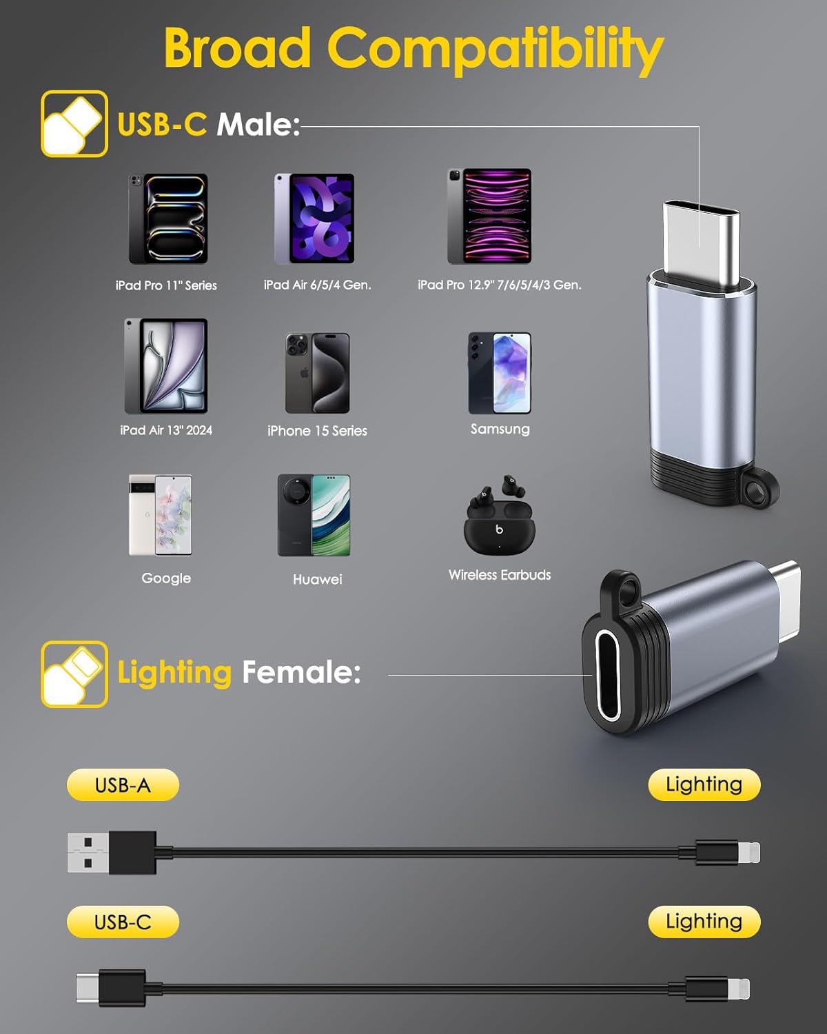 - Wide Compatibility: MoKo Lightning to USB C adapter is an ideal solution for connecting USB C devices to Lightning cable, widely compatible with iPhone 16/16 Pro/16 Plus/16 Pro Max, iPhone 15/15 Pro/15 Pro Max/15 Plus; Galaxy Z Flip/Fold 5, Galaxy S24/23/22/21, S24/23/22/21 Ultra, S24/23/22/21 +, Galaxy Note 20/20 Ultra, Galaxy Note 10/10 Plus; HTC U12; LG V50; Google Pixel 7/6/5/4 and other devices have Type-C Port.