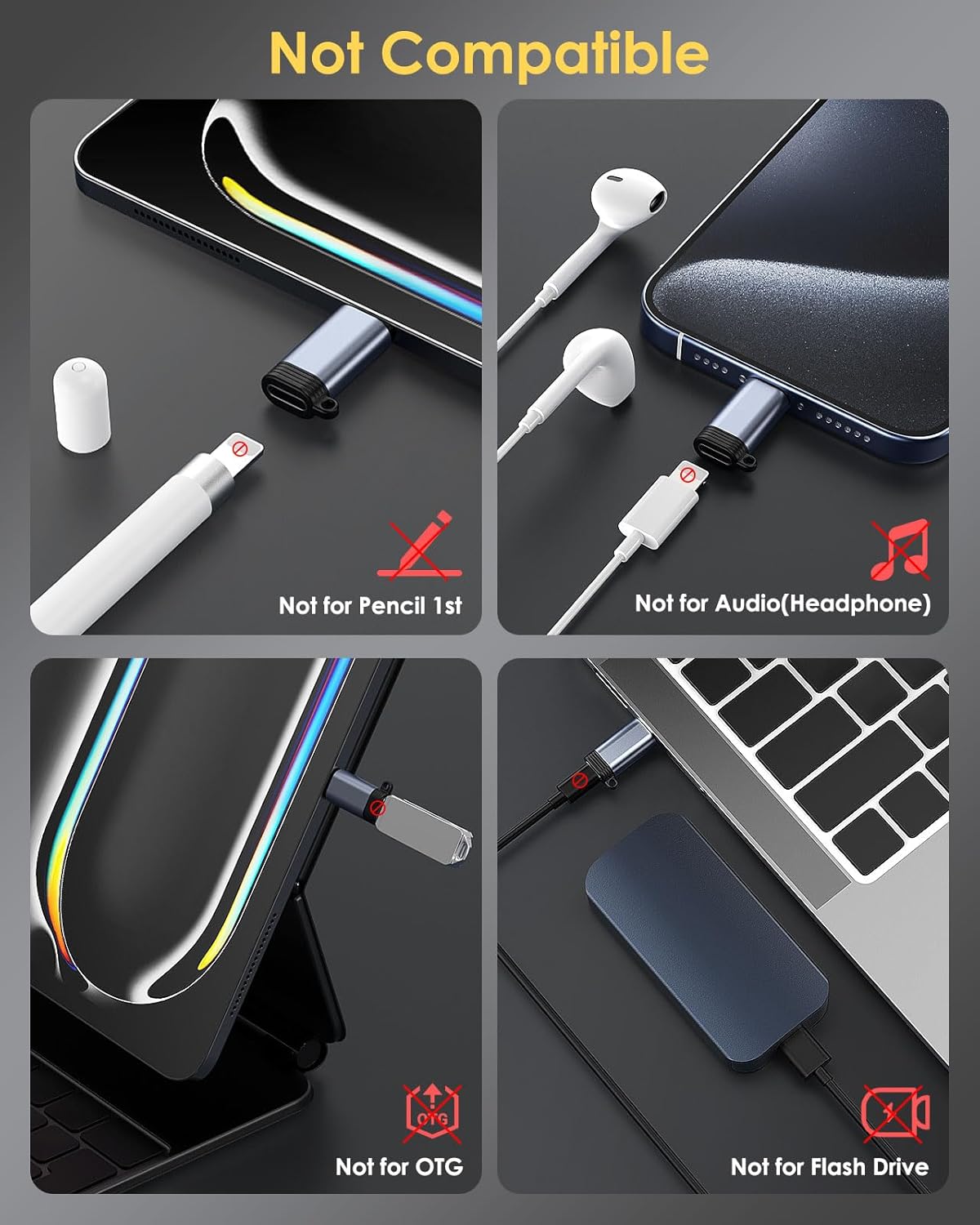 - NOT Support Audio and OTG Functions: ONLY supports charging and data transfer between phone and computer. Do not support headphones. Do not support OTG audio and video functions. Not for Apple Pencil (1st Gen.), mouse, keyboards, USB flash drives, card readers, printers, microphones, HDMI converters and cameras.