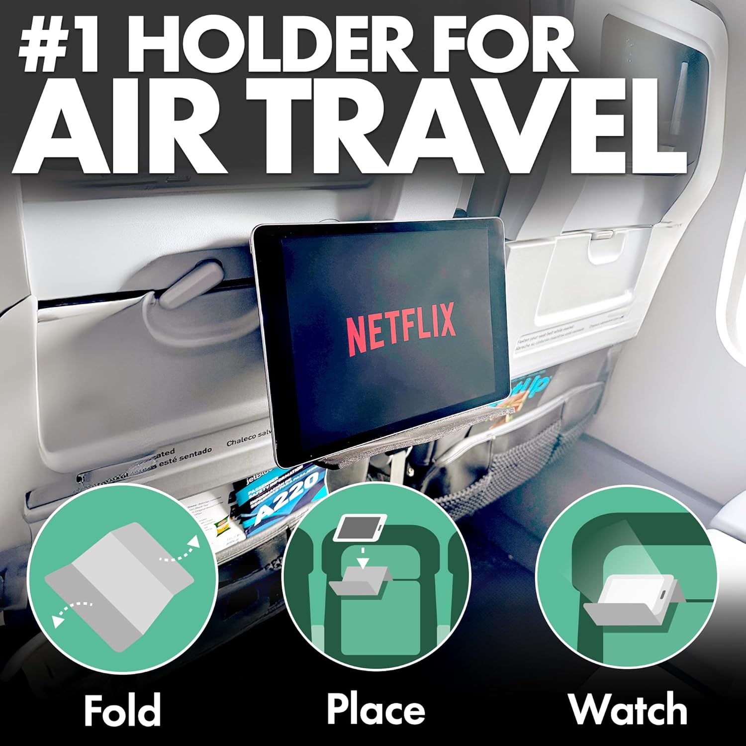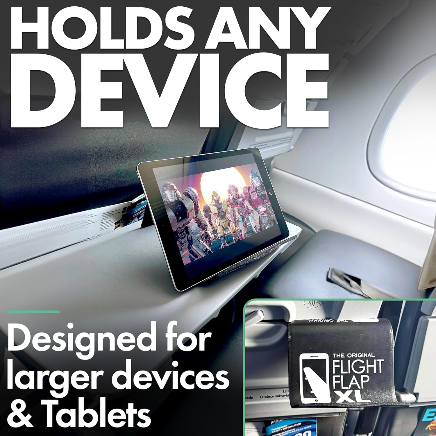 - USE FOR TRAVEL, WORK & LEISURE – Great for watching movies, entertaining kids, streaming workouts, hosting a zoom video call, or cooking with recipes on your phone. Use the FLIGHT FLAP XL's tablet stand desk anywhere to grip your device and view your content comfortably. Attaches to most airline seat backs and tray tables. During car rides, attach behind the headrest and stream movies for kids. Properly positions your phone or tablet to host zoom meetings.