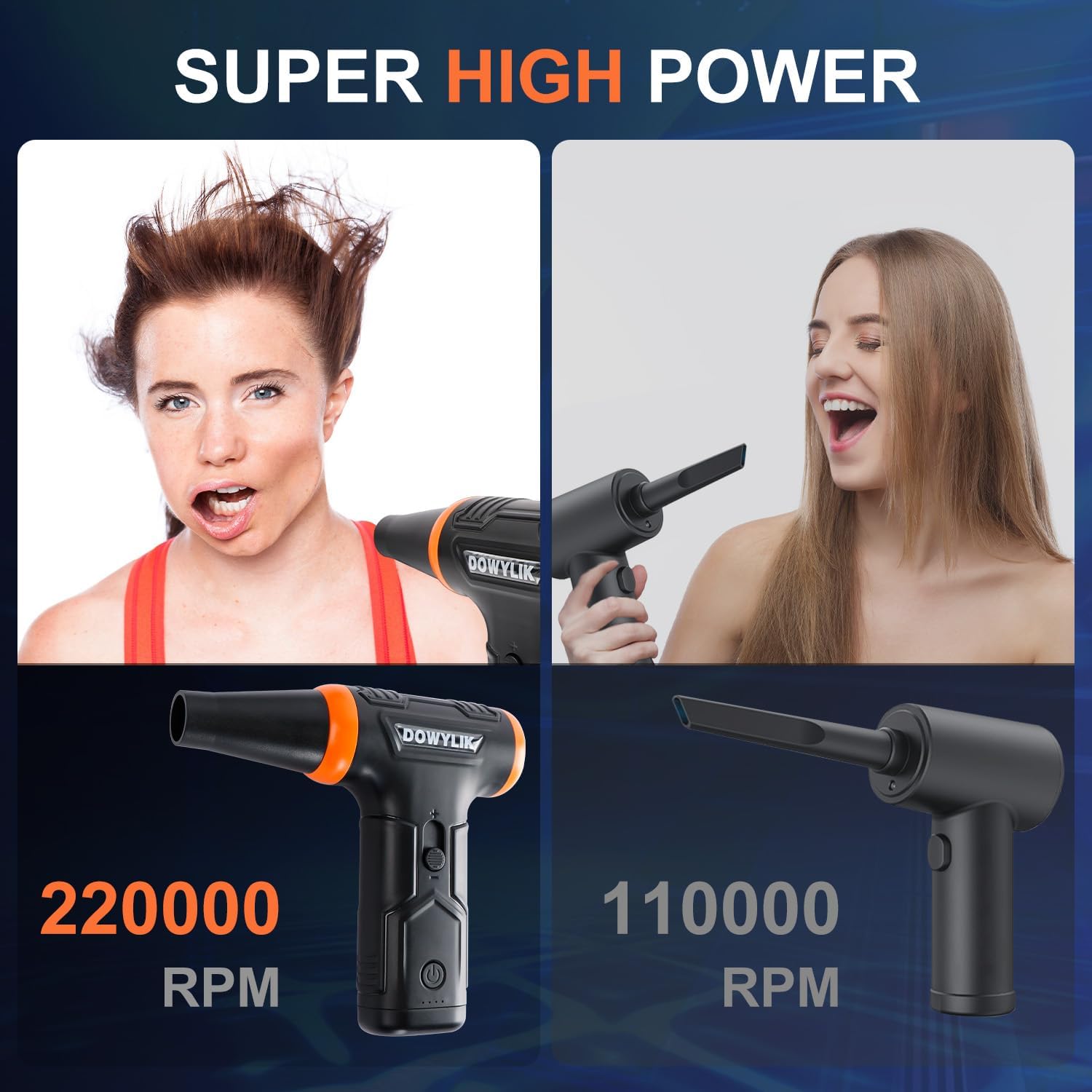 - 🔥220000RPM High-Power Compressed Air Duster: The DOWYLIK compressed air duster features an upgraded brushless motor, delivering 80,000RPM to 220,000RPM of adjustable airflow. It efficiently removes dust, pet hair, and debris from keyboards, computers, laptops, and car interiors. Unlike disposable compressed air cans, this canned air duster for computers is rechargeable, eco-friendly, and cost-effective. The built-in LED light ensures effective cleaning even in dark spaces