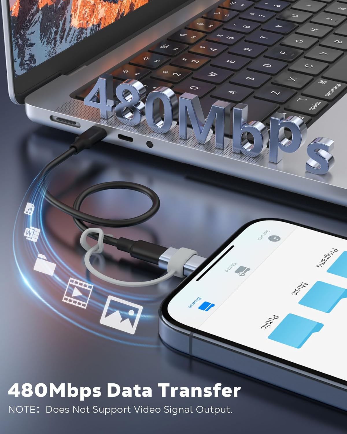 - Support Charging and Data Transfer:This USB C to iPhone adapter enables charging and 480 Mbps data transfer speeds, making iPhone or iPad directly compatible with USB C to USB A cables and USB C to USB C cables. Save the hassle of carrying around extra data cables.
