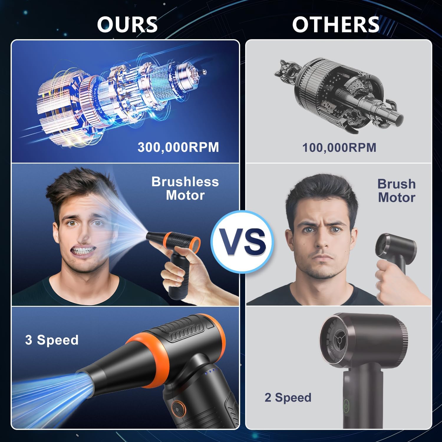 - 【3 Speed Adjustable Air Duster】: This air duster is featuring one button for easy operation. To adjust the speed, click 1-3 timesto adjust from first speed to third speed, allowing you to select from a wide range of speeds, between 80,000 RPM and 300,000 RPM, depending on your cleaning needs. Whether you're cleaning PC, keyboard, or larger surfaces, this air duster offers precise control and convenience, making it an essential tool for everyday use