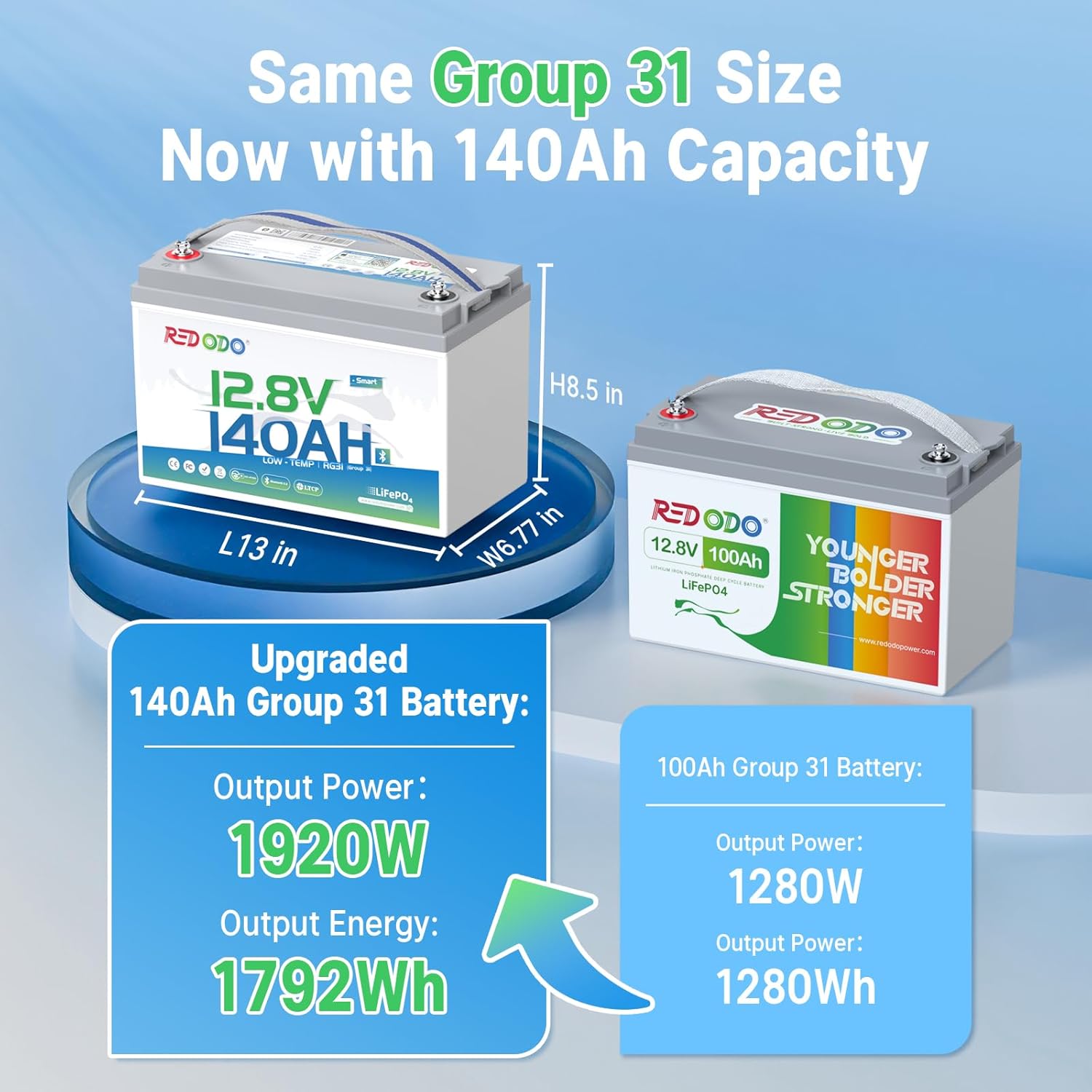 - 【UPGRADE - CAPACITY INCREASED BY 28.6%】 Redodo 12V 140Ah Group31 LiFePO4 battery capacity upgraded on the basis of 12V 100Ah Group31 lithium battery, same volume, more capacity! Not only batteries, but also intimate partners for your RV travel!