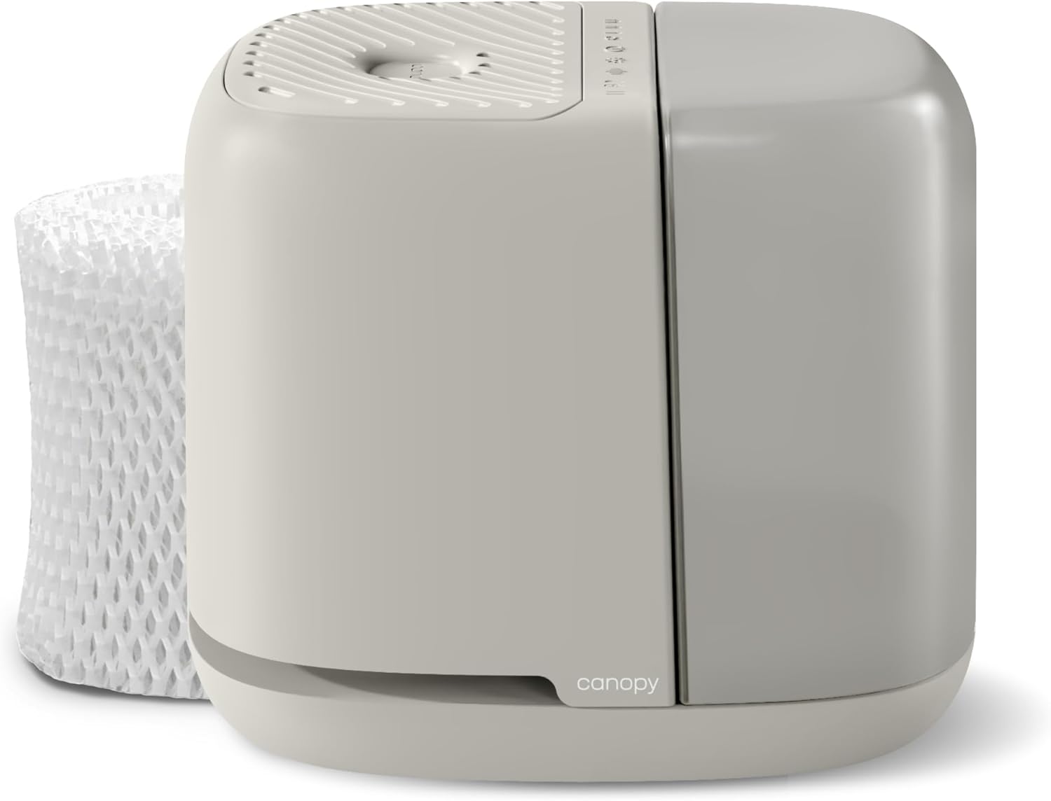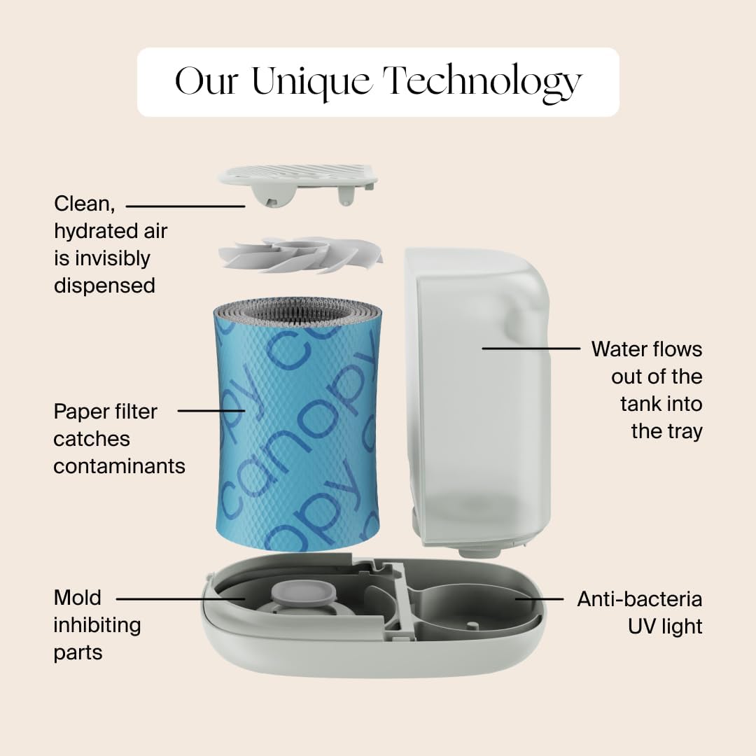 - THE HEALTH BENEFITS OF HUMIDITY: The Canopy Humidifier helps optimize your living space to have the ideal level of humidity. Ensuring proper humidity helps to hydrate skin; combating dryness, dullness and fine lines & wrinkles. Increased skin barrier function to protect from pollution. Alleviate cough, nasal congestion and other symptoms of cold, flu and allergies. Provide clean and safe aroma diffusion for a calming environment
