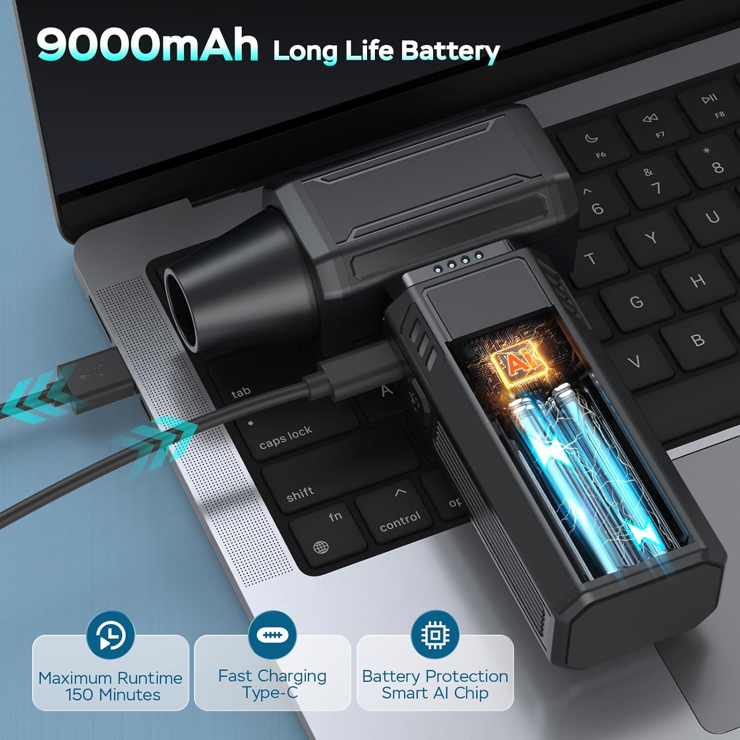 - 【Long-Lasting Battery】Powered by a robust 9,000mAh battery, this mini blower provides up to 150 minutes of use on the lowest setting for extended operation and up to 20 minutes on the highest setting for maximum performance. Ensuring exceptional flexibility and versatility, the long-lasting battery supports a wide range of tasks.