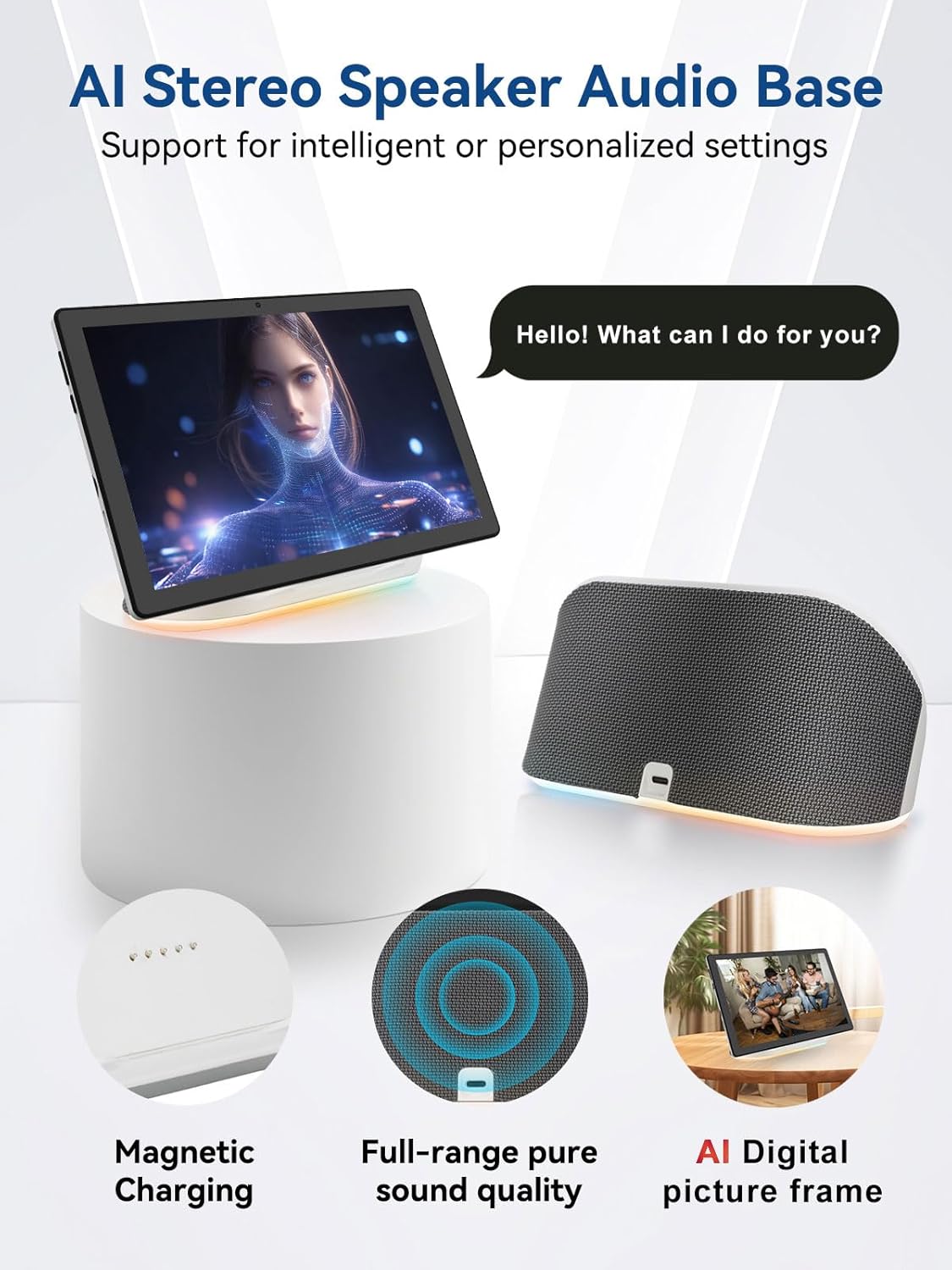- đ”ăAll-in-One AI Stereo Speaker DockăTransform your Jeazans tablet into a multifunctional hub with the AI Smart Speaker Dock. Keeps it charged and ready 24/7 and doubles as a great-sounding speaker for room-filling music while ambient lights sync with your music for an immersive audio-visual experience. Dive into relaxation with 8 built-in white noise environments, or switch to the AUMI AI OS clock screensaver mode to use it as a digital clock. It doubles as an electronic cloud photo frame, showcasing your favorite memories. Combining charging, entertainment, and utility, this dock redefines tablet accessories.