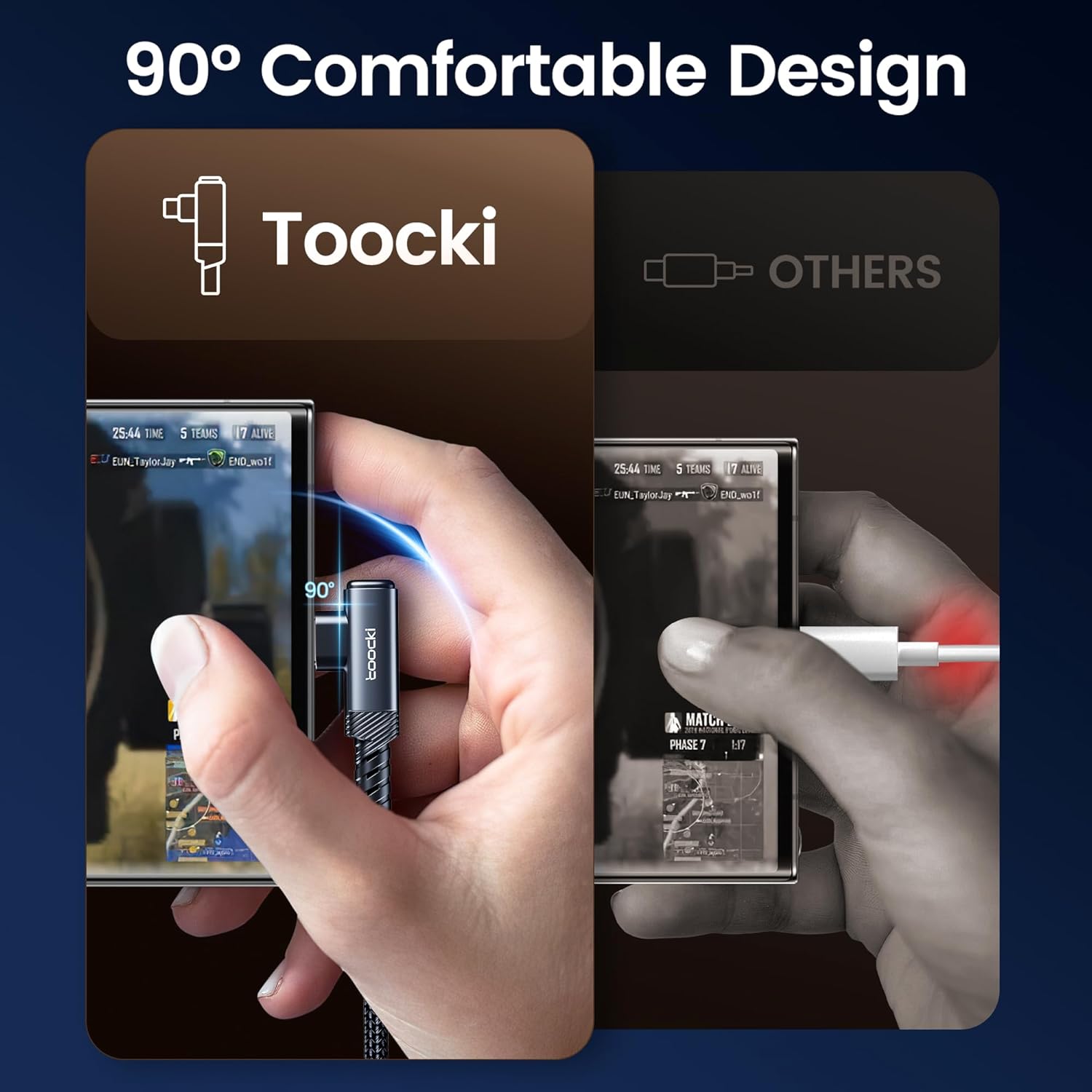 - 【3A Fast Charging】toocki USB C Cable Right Angle support 5V 3A, 9V 2A or 12V 1.5A fast charge, and QC3.0 AFC FCP Protocol, providing with a transfer speed of up to 480Mbps.(USB2.0)