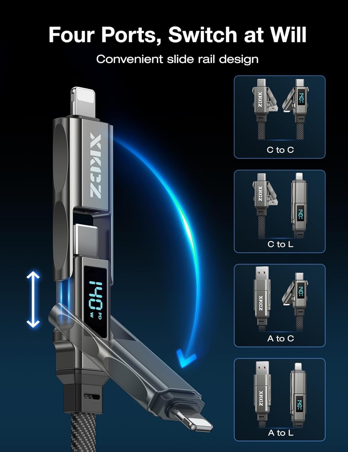 - Special Feature : 140W Fast Charging, 4 in 1 Versatile Cable, Flat Anti-tangle Nylon Braided, Real-Time Wattage Display, TITAN Alloy Shell 140W Fast Charging, 4 in 1 Versatile Cable, Flat Anti-tangle Nylon Braided, Real-Time Wattage Display, TITAN Alloy Shell