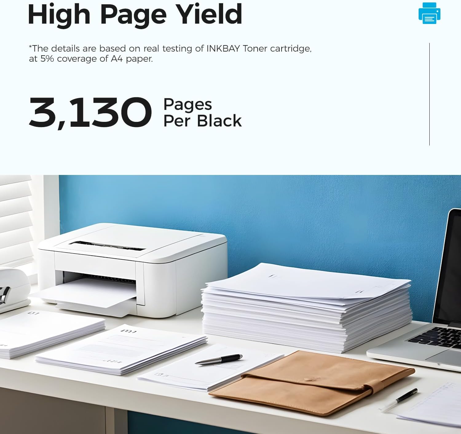 - High Page Yield: Black yields up to 3,130 pages each black, total yields up to 6,260 pages (at 5% coverage of Letter A4)