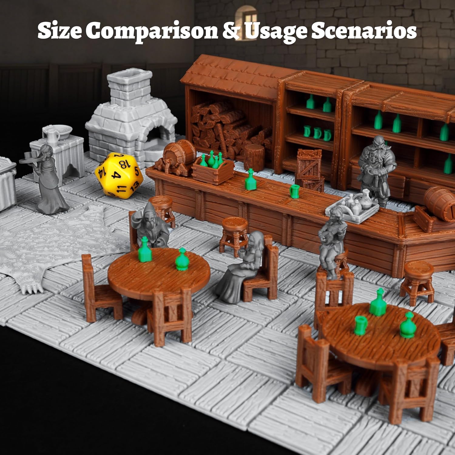 - Highly Detailed 3D-Printed Miniatures – This RPG terrain set includes intricately designed tavern furniture, such as shelves, stools, bar counters, barrels, and decorative elements, perfect for enhancing your DND terrain sets and tabletop RPG game environments.