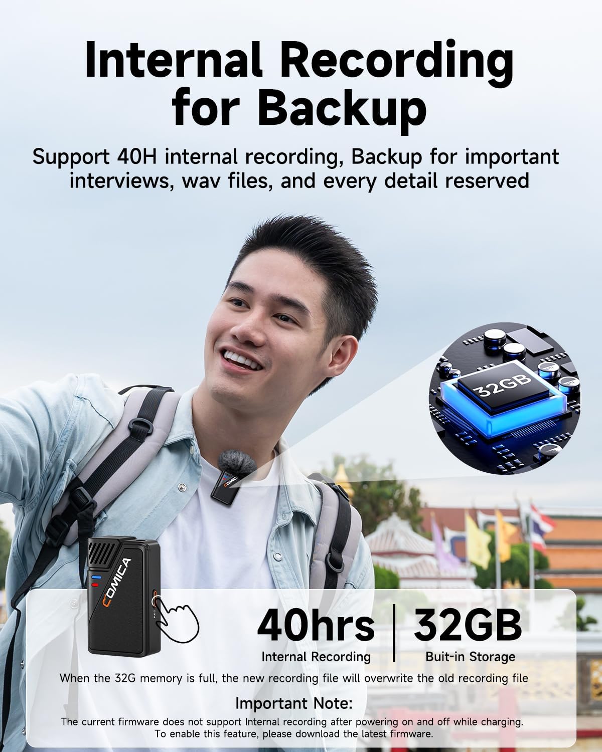 - ă32G Buit-in Storage, 40H Internal RecordingăComica BooMax wireless lapel microphone boasts a remarkable internal recording for storing your recording files in real time. 32G Buit-in Storage - store up to 40 hours of recording, which can be used for audiobackup or as a voice recorder during filming.