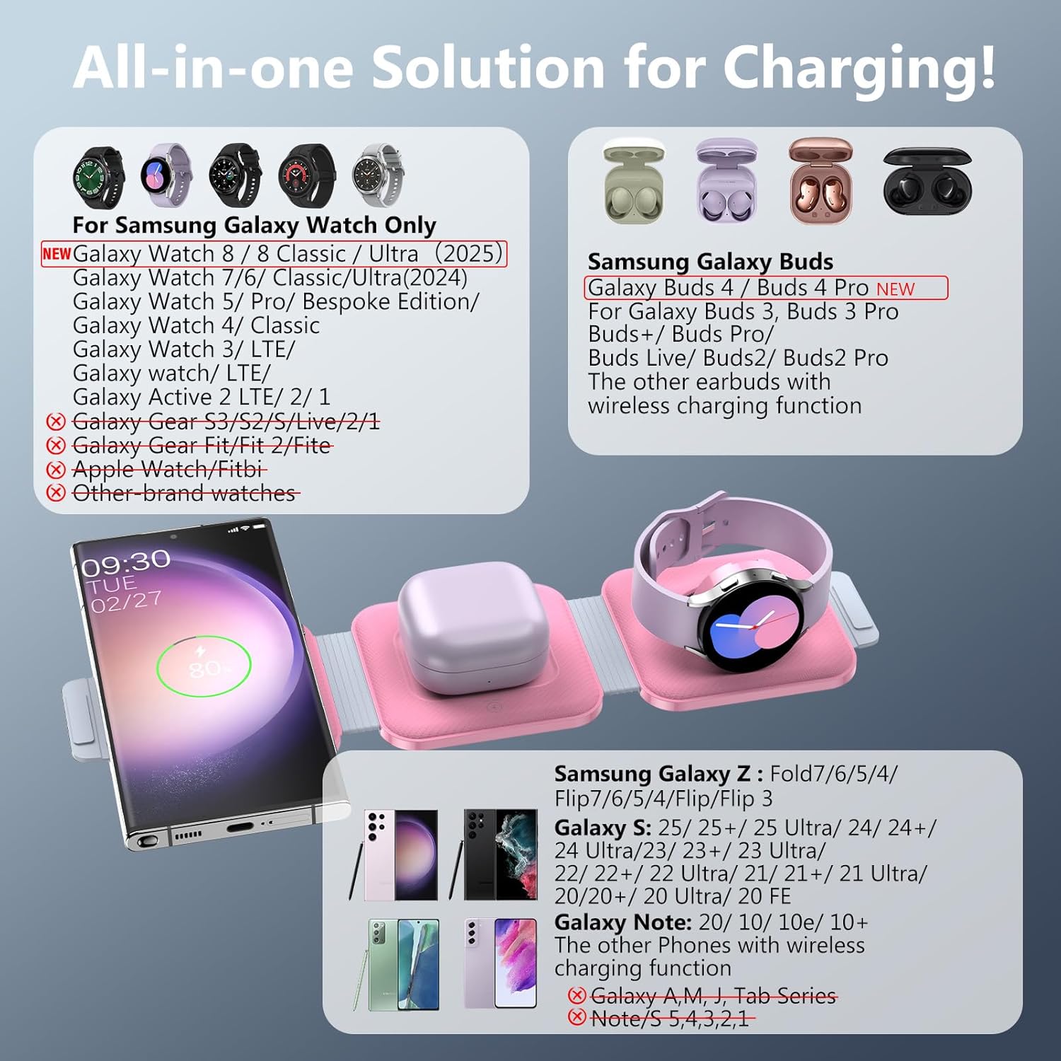 - WIRELESS CHARGER FOR SAMSUNG: All-in-one solution for charging! compatible with Samsung suite of devices, For Samsung Galaxy S25/S24/S23/S22/S22+21Ultra/S21/S21+/21Ultra/S20/S20+/S20 Ultra/S 20 FE (5G Version) Galaxy Note20/10, Galaxy Z Flip 7/6/5/4/Z Fold7/6/5/4 and other Phone with wireless charging function. For Galaxy Buds4/3/2/Pro/Live/Buds+ and other TWS earbuds. ONLY compatible with Samsung Galaxy Watch, Galaxy Watch Ultra 8/7/6/5/4 Classic/Active 2 LTE/2.(NOTE: Not support for Galaxy Watch "Gear" Series)