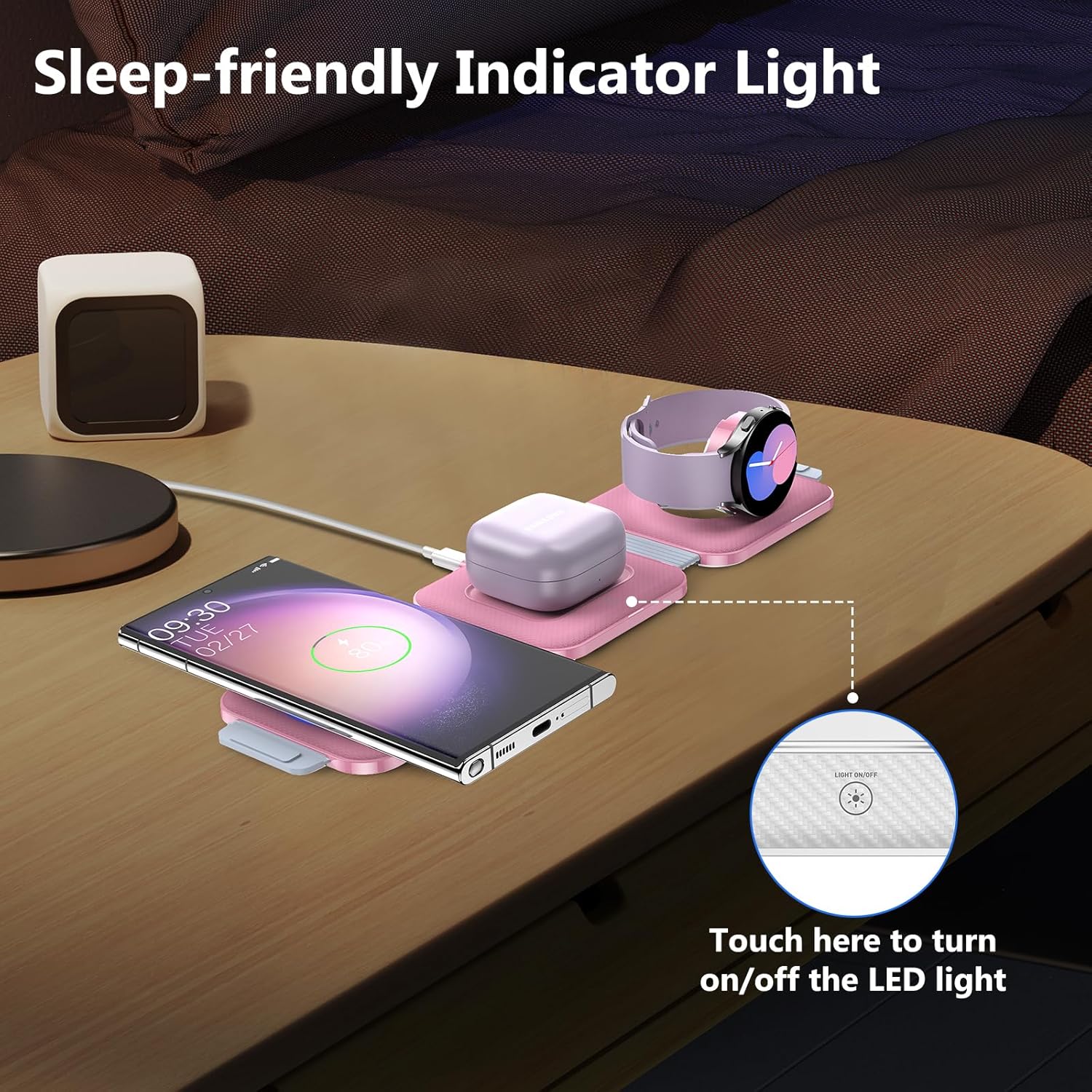 - SLEEP & USER-FRIENDLY CHARGER: Design with a turn ON/OFF function. Easy to turn off the LED light with the touch button (next to the earbuds charging area). 3 In 1 design solving the problem of messy charger cables on your desk. The foldable and adjustable design makes your business trip and vacation convenient and happier.