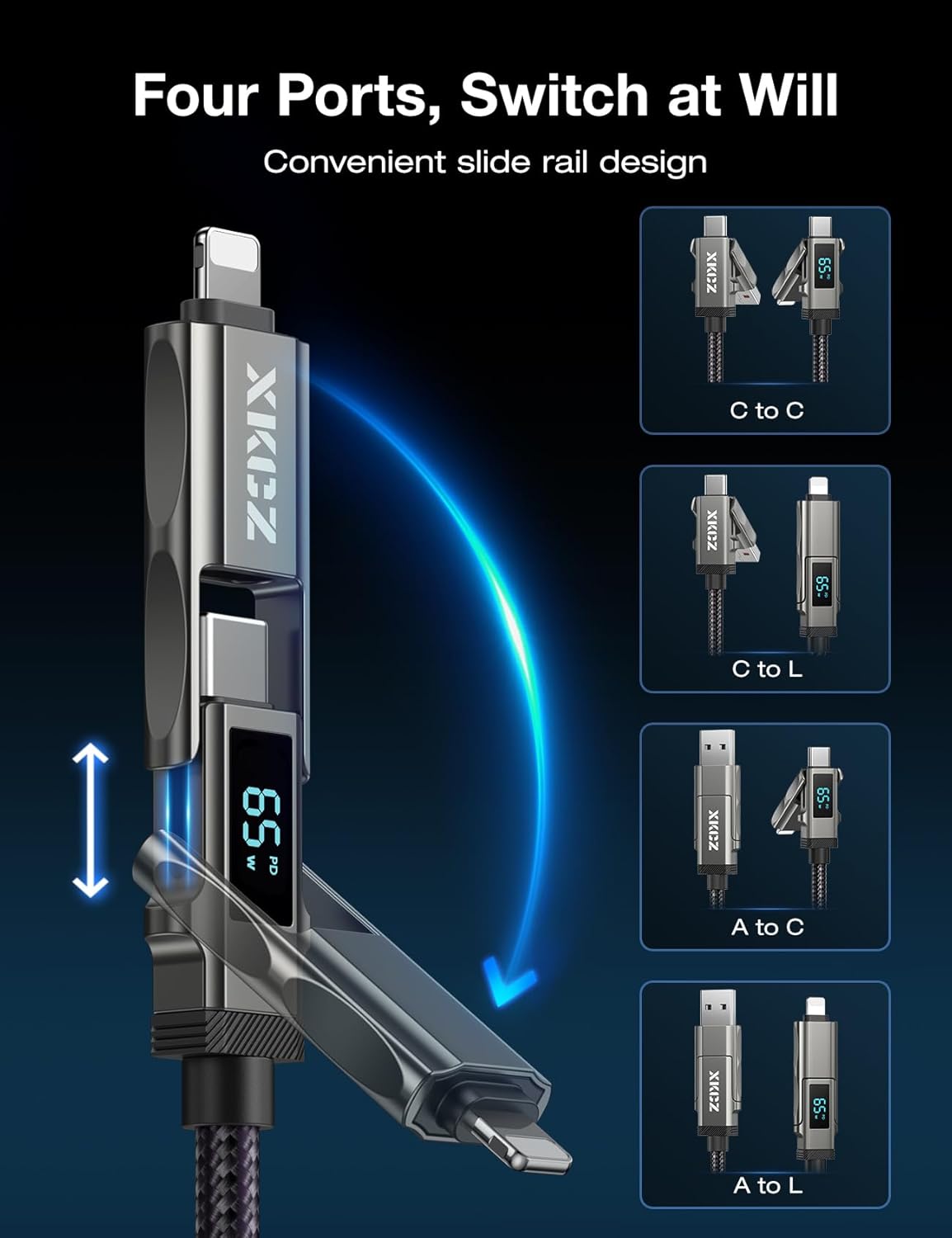 - [4-in-1 Versatile Cable] XKCZ Fast Charging Cable is designed to simplify your life. It has four ports, combines - USB C to USB C, USB C to L, USB A to L, and USB A to C - in one cable. One cable meeds all your charging needs