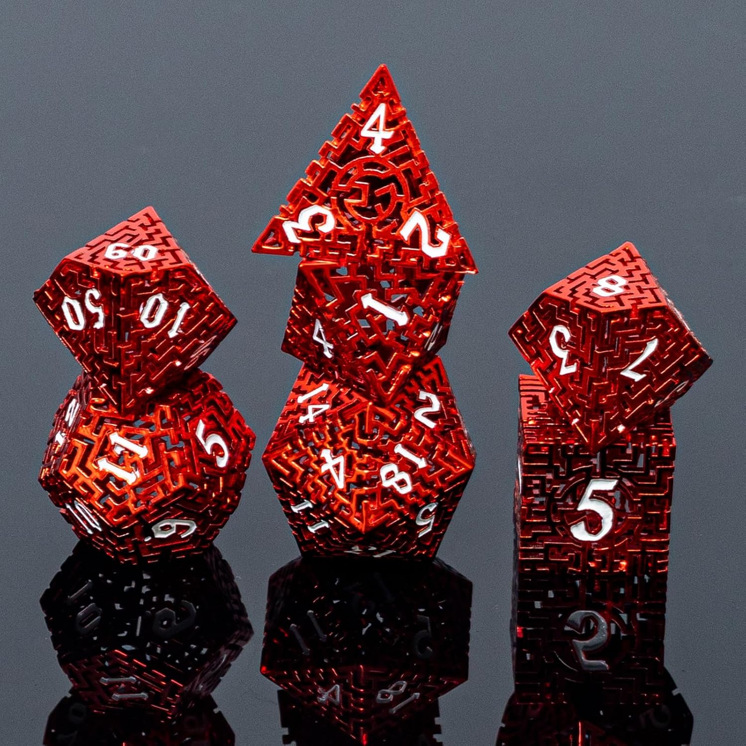Red Metal Hollow DND Dice Set (Barbarian) Metallic Luster Maze Design with Storage Box - Balanced Weight 7 Piece Zinc Alloy, Designed for Dungeons and Dragons DM and Player RPG Accessories