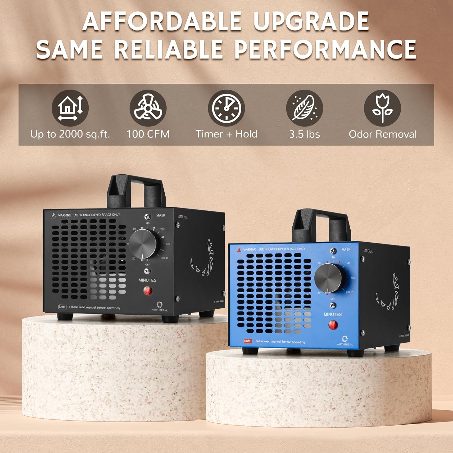 Airthereal MA5K Ozone Generator for Home, Ozone Air Ionizer Odor Eliminator with 120-Min Timer, Lightweight Design, Odor Removal for Car, Smoke, Pets, Basements, Covers Up to 2,000 Sq. Ft., Black