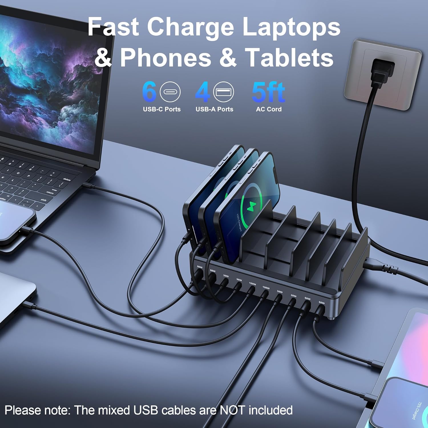 - 500W High Power & 10-Port Efficiency: This multi device charging station can significantly meet your daily charging needs. Delivers up to 500W total power with 10 charging ports (C3/C4:100W, C1/C2/C5/C6:30W, A1-A4:60W), fast charging laptops, tablets, phones, and more simultaneously for maximum efficiency